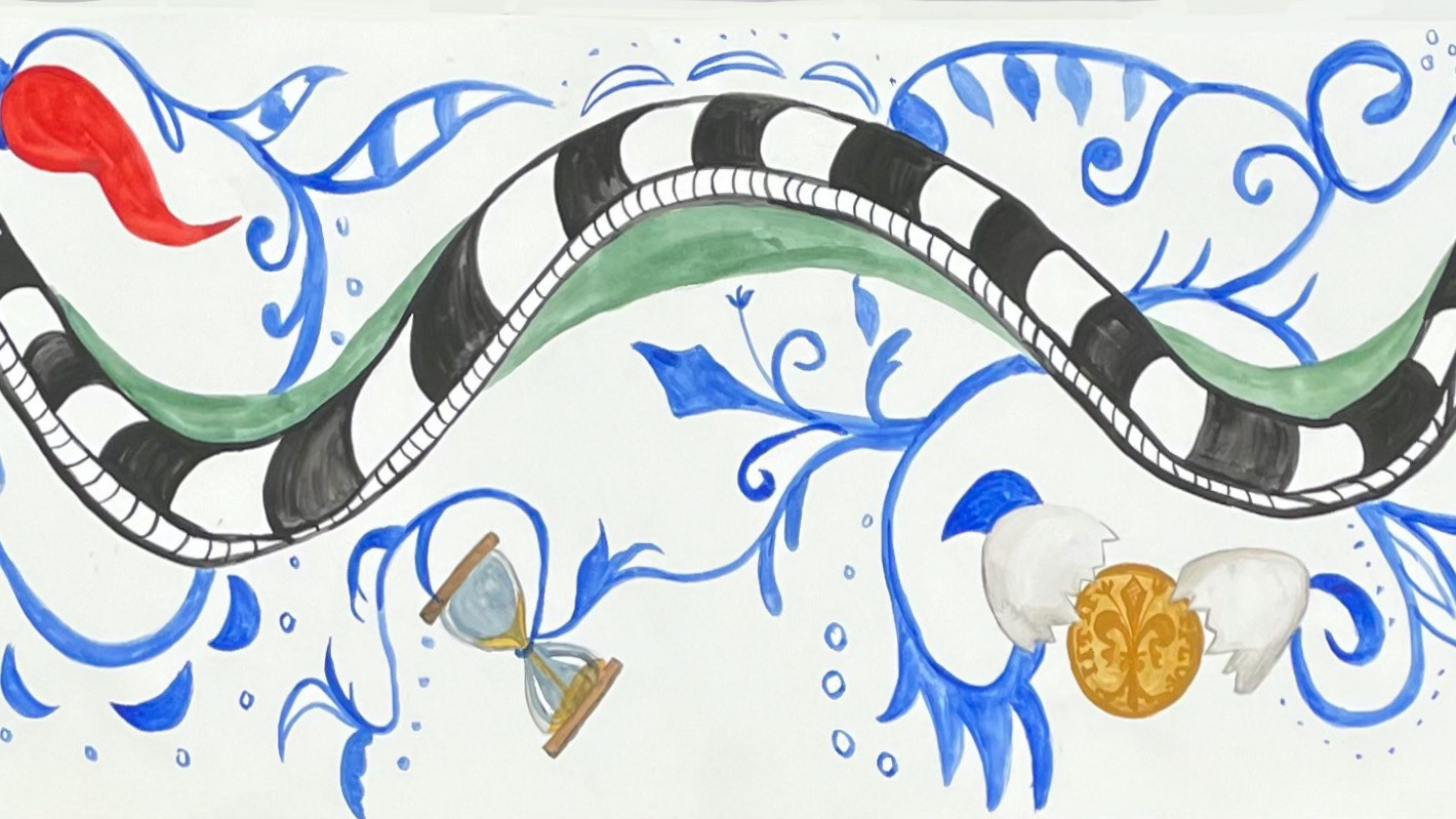 Tradition, Creation, Ceremony (Long Panels), gouache, ink, collage, and leaf on paper, 18” x 6’ , 2019