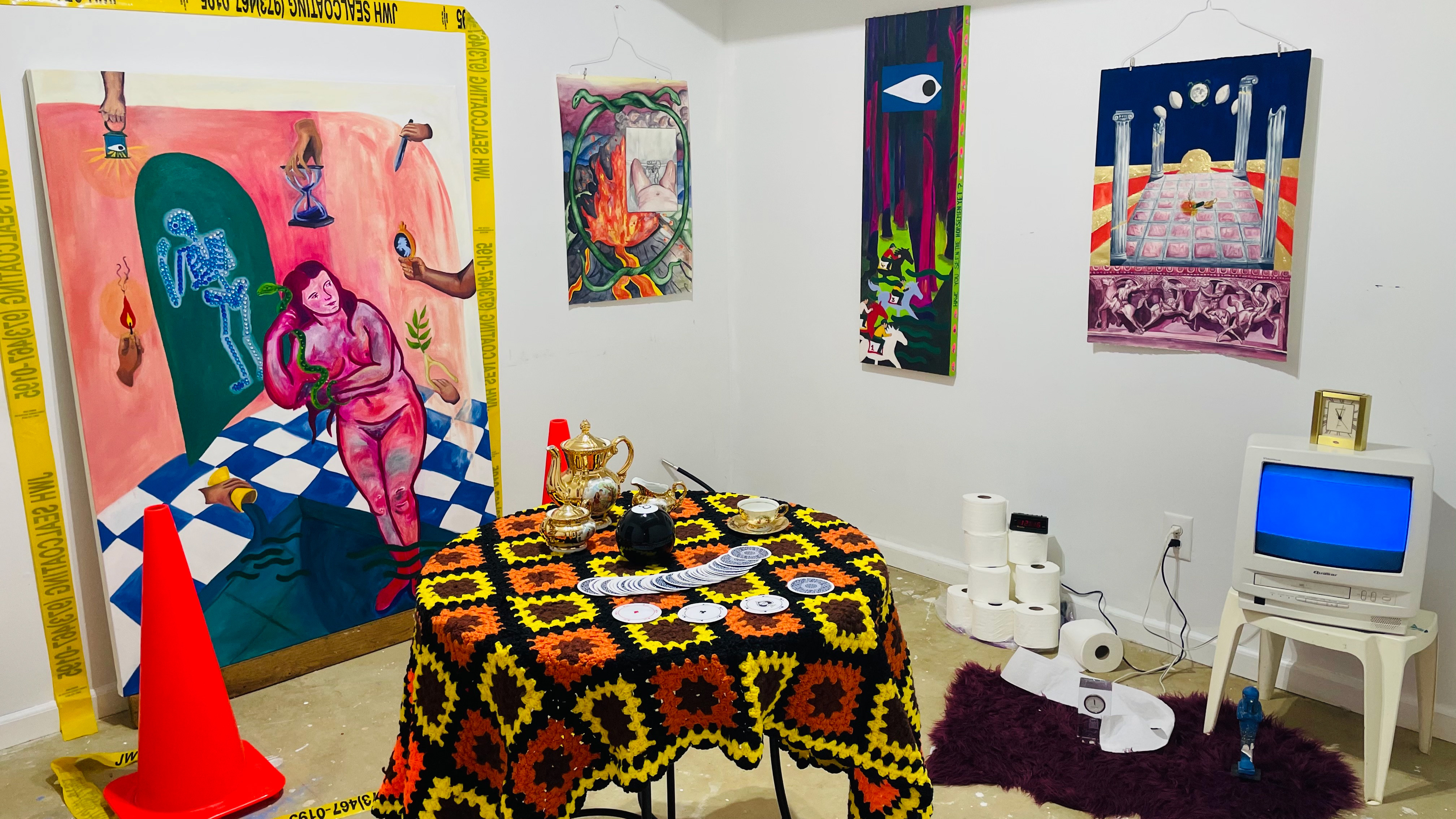 Acting as a collector of image and material, I enjoy the ritualistic nature of collage; working minimally to emphasize the symbols as having a presence in their larger installation. The title of each piece paired with the imagery prompts the viewer to develop their own relationship and question how image prompts reflection, thought, and meaning. The blend of collage and painted imagery forms a sort of puzzle where the individual relationships between symbols create meaning as a whole, ultimately using the known to create the unknown.